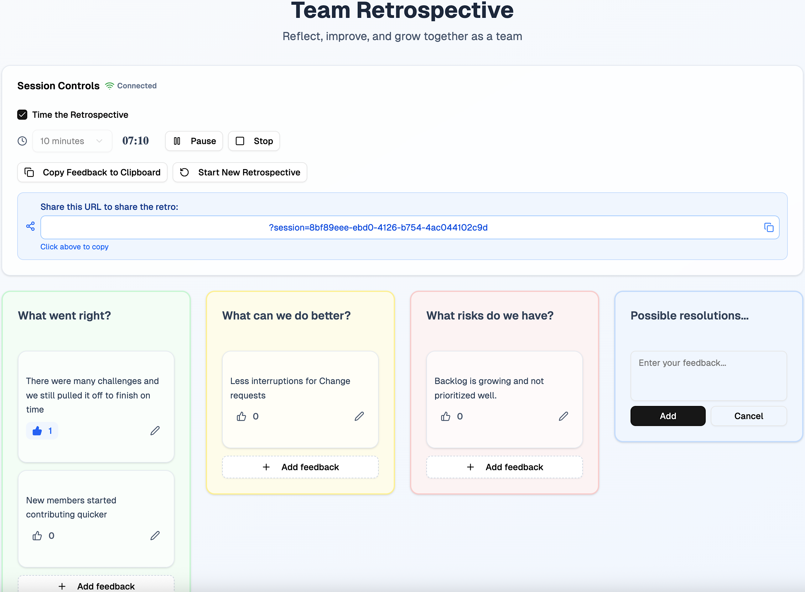 How to create a truly collaborative real-time retrospective experience? Here is one way...You'll get a true real-time synchronization with feedback updates from multiple team members in parallel using this web application tool created specifically for this purpose.